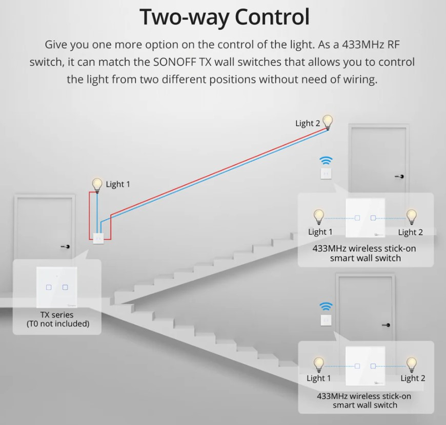 Dispozitivul se poate conecta cu intrerupatoarele SONOFF T1/T2/T3 pentru a realiza o conexiune tip cap-scara. Folosit impreuna cu Basic RFR2 si RFR3, 4CHPROR3 si SlampherR2, va ofera inca o modalitate de control.