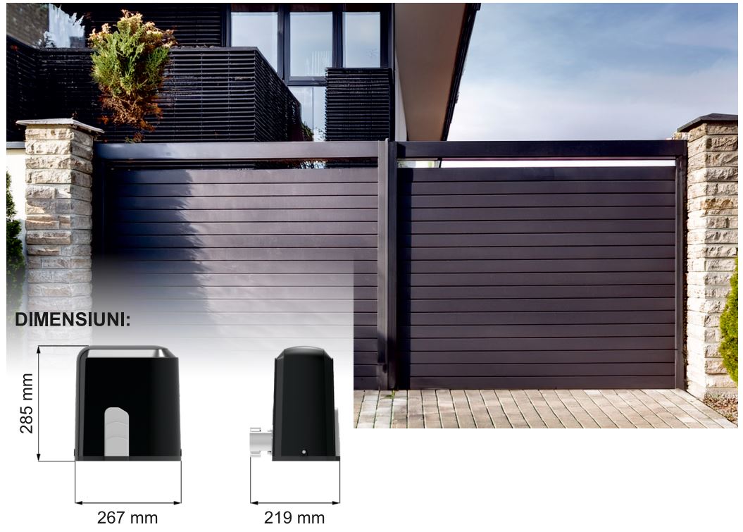 Sistem de automatizare pentru porti culisante proiectat pentru aplicatii rezidentiale sau comerciale usoare, destinat portilor cu greutate de pana la 600 kg si lungime maxima de 8 metri.