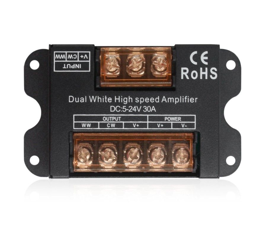 Amplificatorul LED CCT de mare viteza este conceput pentru extinderea semnalului de control al benzilor LED cu doua tonuri de alb (alb cald si alb rece). Este utilizat in sisteme de iluminat unde este nevoie de putere suplimentara pentru a sustine lungimi mai mari de benzi sau mai multe circuite LED conectate la acelasi controller. Permite o reproducere fidela a culorii si o comutare rapida a semnalului PWM, fara pierderi de intensitate sau diferente de nuanta intre segmente.