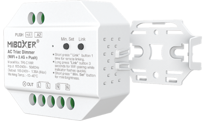 TRI-C1WR este un dimmer triac avansat pentru controlul luminilor, care utilizeaza tehnologiile WiFi, 2.4G RF si Push pentru a oferi un control flexibil si eficient al sistemelor de iluminat. Acest dispozitiv este compatibil cu lampile incandescente traditionale, lampile cu halogen si lampile LED dimabile, permitand ajustarea continua a luminozitatii pentru a crea atmosfera perfecta in orice spatiu.