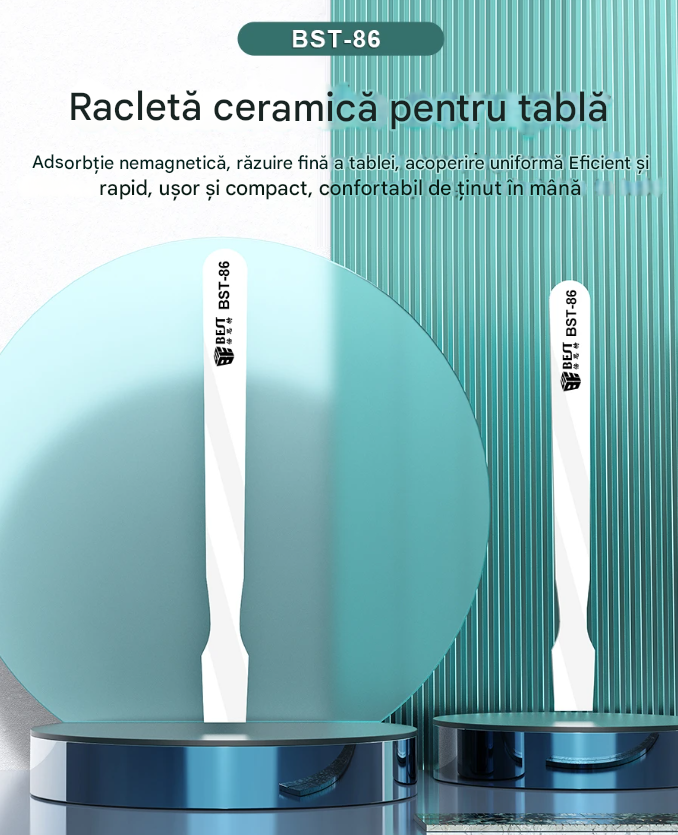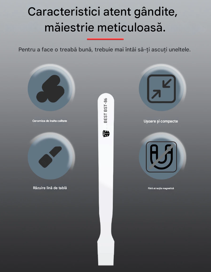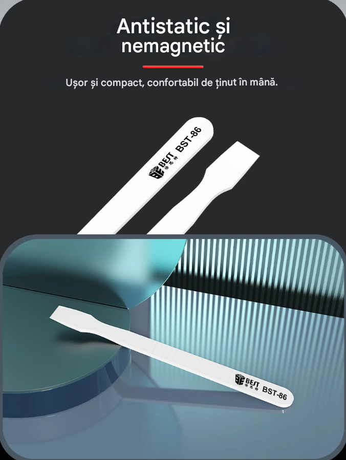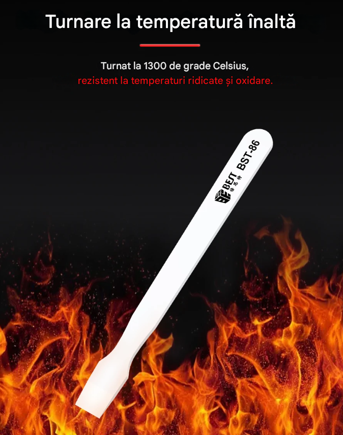 Spatula ceramica BST-86 este un instrument simplu si eficient pentru indepartarea cositorului de pe placile electronice. Nu atrage metalul, nu afecteaza componentele si rezista la temperaturi foarte ridicate. Este usoara, confortabila si ideala pentru lucrari de reparatii la telefoane, laptopuri sau alte echipamente electronice.