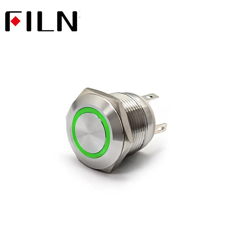 Buton push iluminat fara mentinere, 20A 12–24V DC, 19mm, IP67, metalic, inel LED verde, 4 pini, FLM19-FJ-6-EX000-S11M4-GREEN