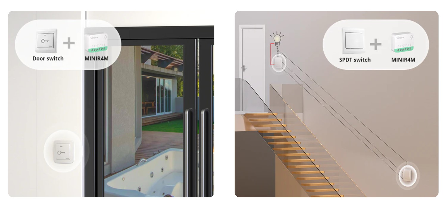 MINIR4M este echipat cu un cip ESP32, dimensiunile sale mici se potrivesc in diverse cutii de montare, inclusiv cutie de montare tip 86/EU, tip 120. MINIR4M accepta controlul comutatorului extern si se conecteaza cu usurinta la comutatorul de moment, la comutatorul de iesire al usii, la comutatorul SPDT, la comutatorul de blocare si chiar la senzori de contact uscat.