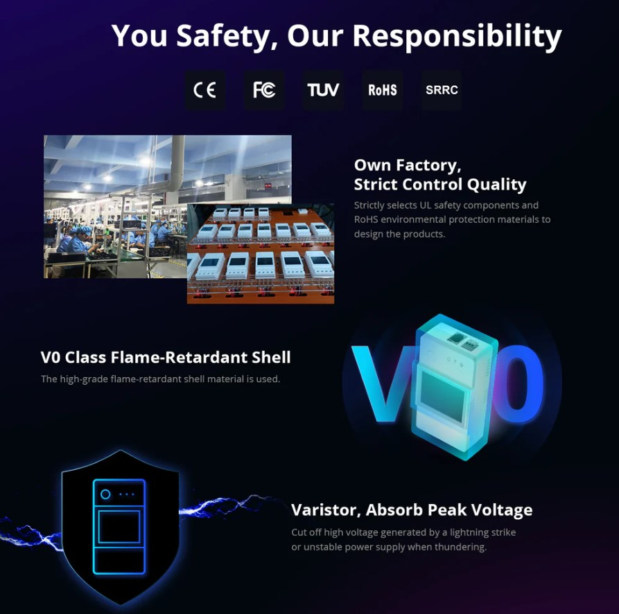 Releu wifi SONOFF pune accent pe siguranta in proiectarea si fabricarea dispozitivelor inteligente pentru casele smart. Asa de face ca acest releu smart TH Elite este realizat din materiale de calitate ce indeplinesc standardele RoHS si vine echipat cu o carcasa rezistenta la temperaturi inalte. Are protectie la supratensiune, cand fulgera sau tuna.