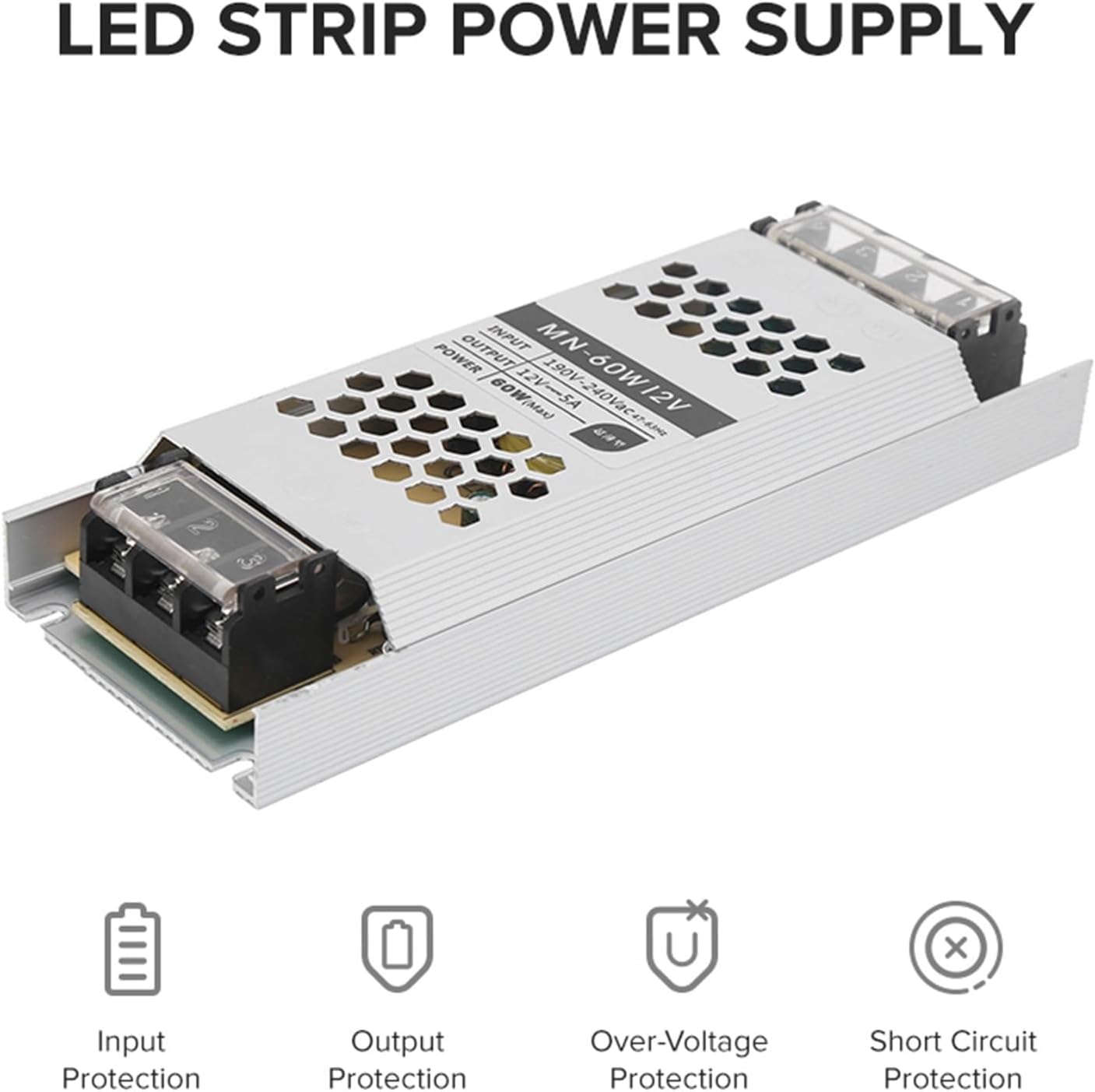 Carcasa din aluminiu, cu design tip fagure, asigura o disipare excelenta a caldurii si un nivel redus de zgomot in timpul functionarii. Sursa este echipata cu protectii multiple: scurtcircuit, supraincarcare si supratensiune, avand capacitatea de auto-recuperare dupa remedierea problemei. Structura compacta permite integrarea usoara in diverse proiecte de iluminat si control industrial.