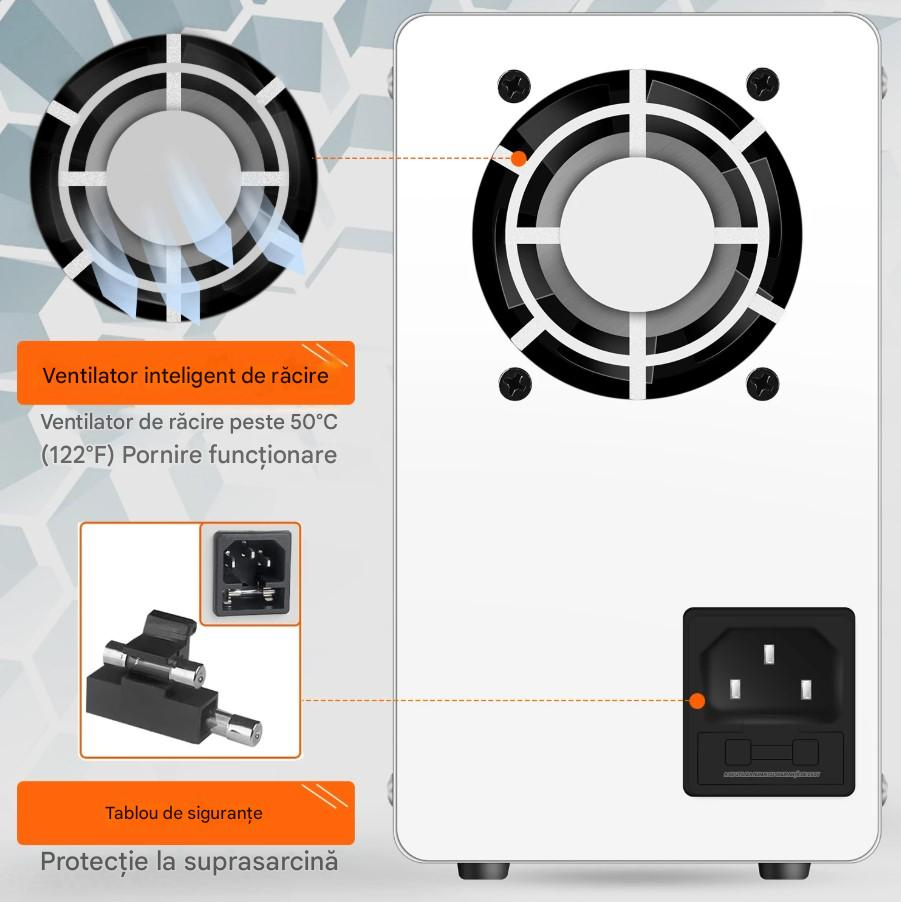 BST-3010D este o sursa de laborator reglabila 0-30V si 0-10A, cu afisaj digital pentru tensiune, curent si putere, ideal pentru electronisti, service-uri si aplicatii industriale. Ofera stabilitate ridicata in regim CV/CC (Constant Voltage / Constant Current) si protectie la suprasarcina. Dispune de port USB 5V/2A pentru alimentarea rapida a dispozitivelor externe. Designul compact si ventilatorul cu control termic asigura racire inteligenta si functionare in regim continuu.