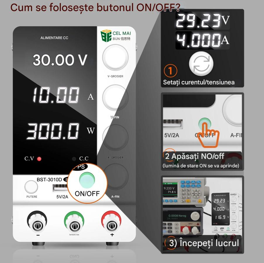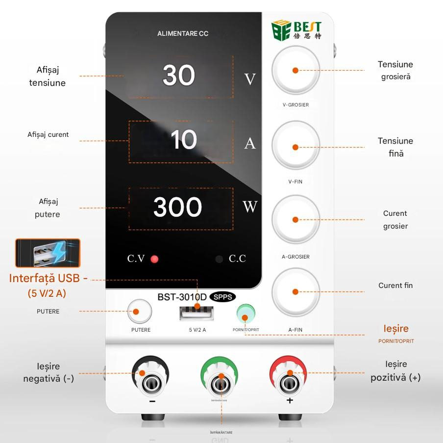 Sursa de laborator BST-3010D, 30V 10A reglabil, afisaj digital, USB 5V/2A, sursa DC stabilizata