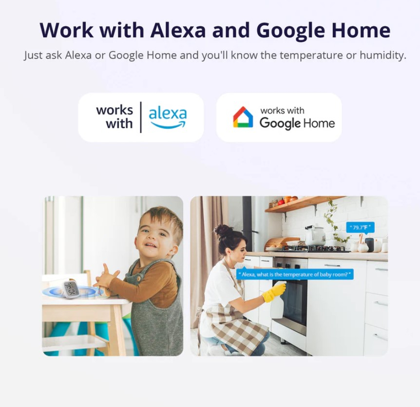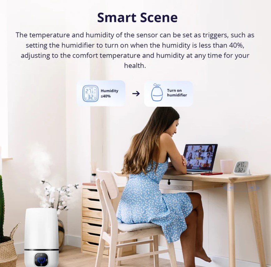 Puteti exporta date ca fisiere .CSV, temperatura si umiditatea senzorului pot fi setate ca declansatori, cum ar fi setarea umidificatorului sa porneasca atunci cand umiditatea este mai mica de 40%, ajustarea la temperatura si umiditatea de confort in orice moment pentru sanatatea dumneavoastra.